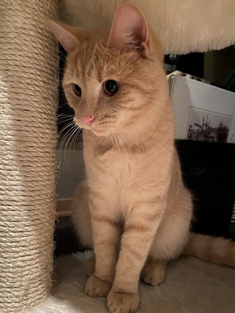 Han har «stripete» hale, annenhver hvit og Orange. Han er en veldig kosete katt og er ikke redd for mennesker eller hunder.