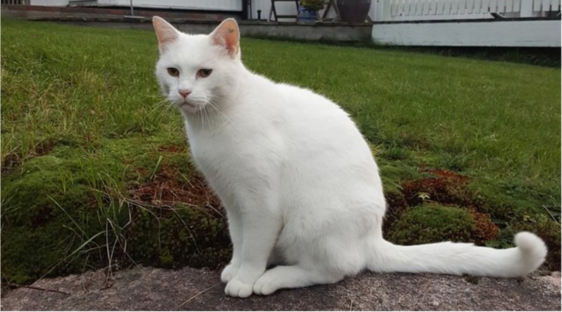 Helhvit stor og normal slank hannkatt. Øremerket på venter øret. Lite hakk i høyre øret. Han er lettskremt og sky for fremmede.
