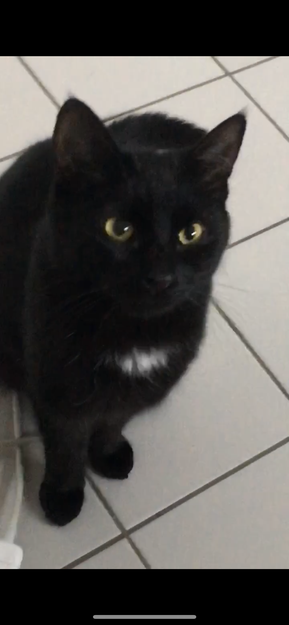 Hun har litt hvit pels på magen og en hvit flekk på brystet. Hun er en veldig snill pus som reagerer på navnet sitt.