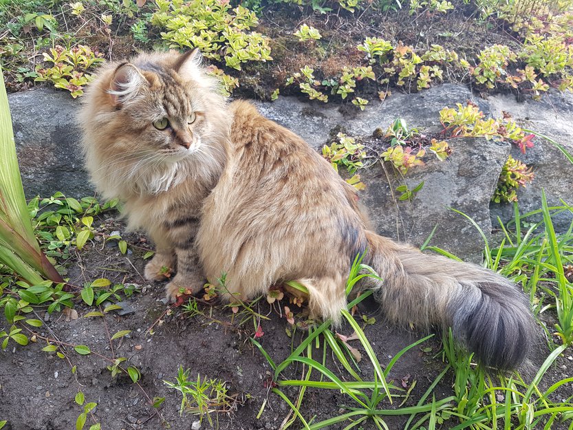 Stor Hunn katt 6 kilo hvit hals og mye sort på hale store poter og forskjellige farger under potene. Hun har tufser i ørene og potene sort M i pannen.