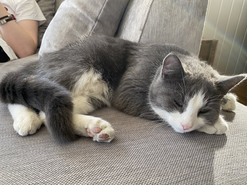 Grå og hvit hannkatt, maks 1-2 år, ikke kasterert, ikke chippet ( sjekket av dyrlege). Godt hold. Kosete, sosial, trygg, «pratete». Tydelig menneskevant. Bløt og fin pels. Korthåret. Veldig fin ung pus :)