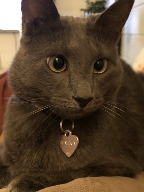 Hun er snart 4 år helt grå godt i hold og og tendens til lettere sjeløyd,og en sofagris