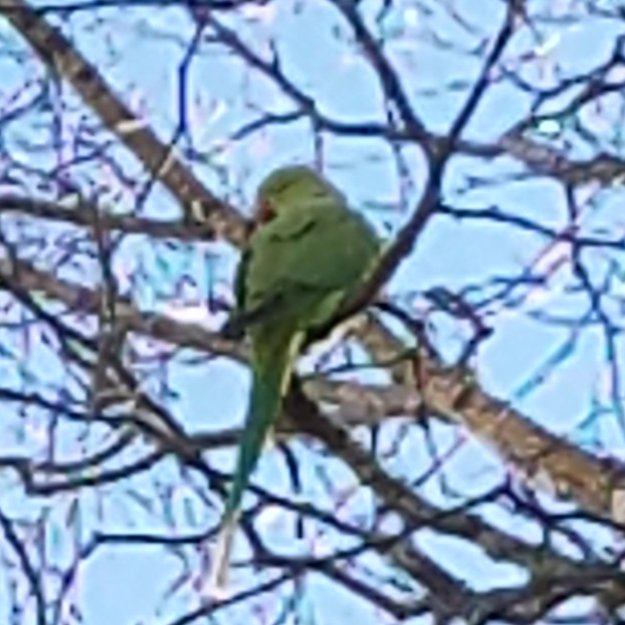 Grønn papegøye, rød nebb. Mellomstor. Relativt lange halefjær. Plystrer men svarer ikke på plystring eller snakking. Klarer ikle å ta godt bilde men det beste bilde jeg har er vedlagt