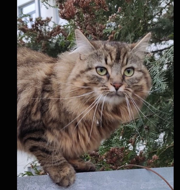 Brun og grå-stripete langhåret hunnkatt. Hvit rett under haken og buskete hale. Grønne øyne. Hun har et rødt halsbånd med bjelle, refleks og kontaktinfo, men dette kan hun også ha mistet.