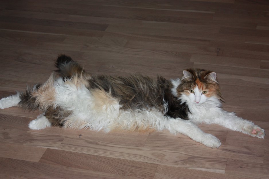 Simba er en liten hunnkatt. Hun har helt hvitt bryst (litt langt hvitt ‘skjegg’) og hvite ben og poter. Hjerteformet ansikt. Spraglete på rygg og ansikt, brun/orange/tricolour. Hun er langhåret og har en fyldig/bustete hale som ofte står rett opp. Hun er glad i mennesker. Hun gir lite lyd fra seg, mjauer knapt.