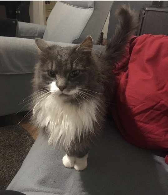 Bravo har lang grå pels, men er hvit på brystet og på potene. Han er en liten katt, veier ca 3 kg.