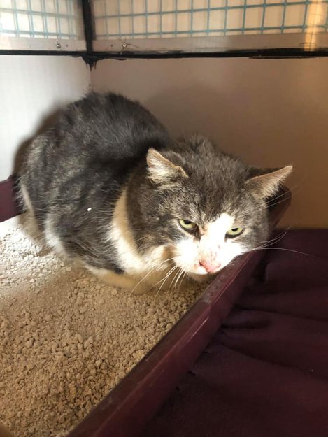Grå og hvit korthåret hannkatt uten chip. Katten er halt, flokete og har flått