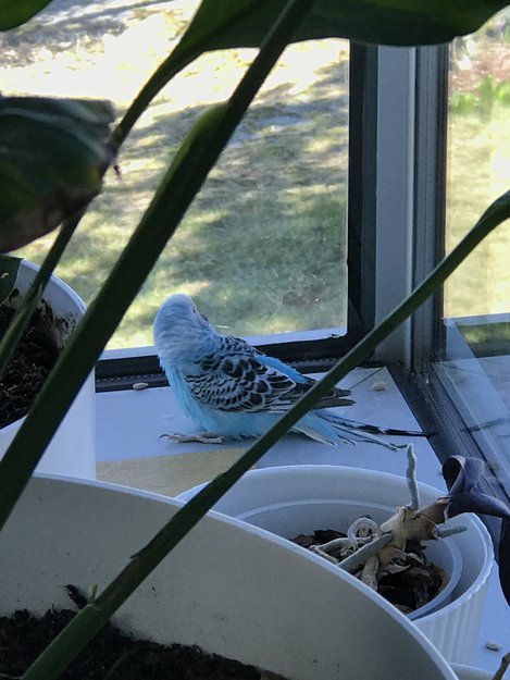 En blå undulat har funnet veien inn til oss. Forholdsvis rolig, og tam.