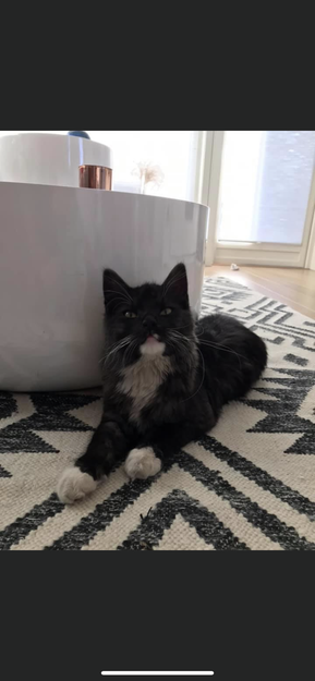 Tillitsfull grå og hvit katt, har vært rundt hele Fornebulandet i helgen. Observert av mange, men vender stadig tilbake til Solgangsbrisen.
