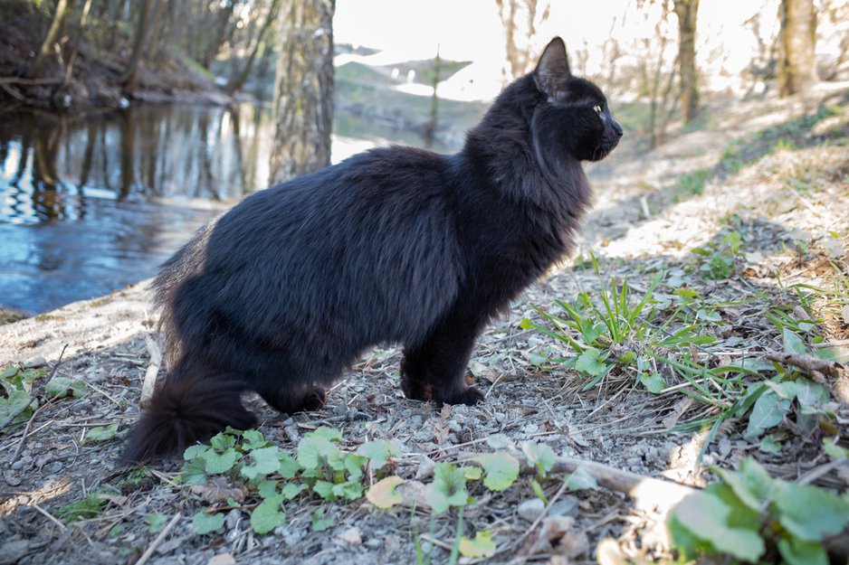 Katten var helt svart, med gule øyne. Ingen halsbånd eller synlig merking. Helt tam, kom bort til meg når jeg "puset" på den, bare det ikke var for mange mennesker på stien.