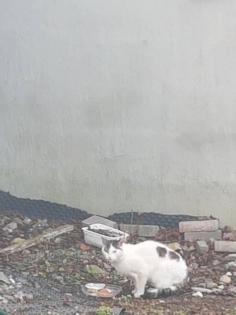 Jeg så denne katten første gangen for over ett år siden. Da så han helt fin og velstelt ut. Han var svært forelsket i naboens hunnkatt. Han holdt til i området utover sommeren og så forsvant han på høsten. Iom at han så så godt ut gikk jeg utifra at noen eide ham. Han dukket opp igjen i våres, og nå er han radmager. Han spiser godt av kattematen jeg gir ham, så jeg håper at han kommer seg, og at eierne dukker opp igjen. Han har et svært mildt og vennlig gemytt. Jeg har katt selv og kan ikke ta ham inn. Jeg har lagt ut innlegg med et bilde til av ham på katt smådyr savnet gruppene på FB.