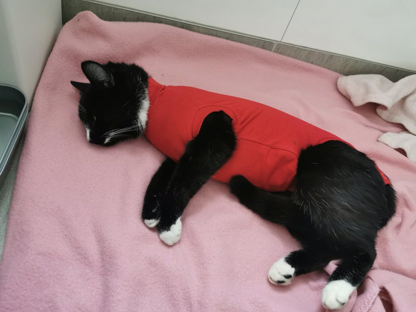 Katten ble sterilisert på fredag og har flyttet til nytt hjem, ikke vært ute i området her før. Smatt ut da barna skulle gå ut tidlig i formiddag. Går med rød body.