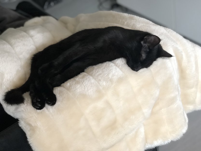 Har en hvit flekk på magen på størrelse med en golfball, samt litt mindre hår/pels over begge øynene.