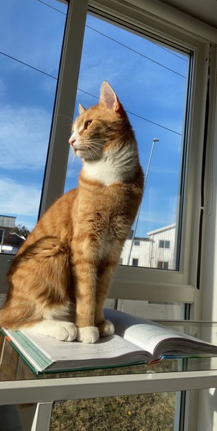 Rød, tigerstripet hannkatt, hvite poter og tegninger i hals/bliss. Ravgule øyne. Langbeint. Kontaktsøkende, går gjerne inn hos andre, ikke redd for hunder