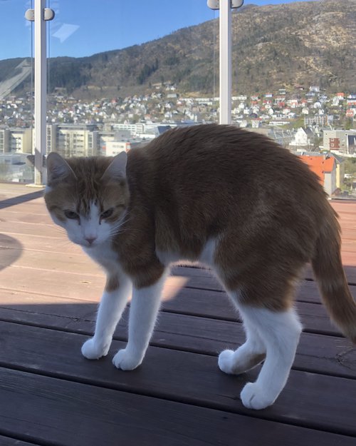 Nå som jeg har vært en del hjemme på grunn av Korona har jeg lagt merke til en katt som oppholder seg på taket der jeg leier. Jeg har sett den luske rundt nesten hver kveld. Og nå i det siste har jeg sett katten på dagtid også. I går kom den bort å snuste på hånden min to ganger, og prøve å komme inn vinduet mitt. I dag gikk den inn til meg og virket veldig sulten. Den snuste mer på hånden min, og virker ikke like redd meg lengre. Jeg føler at den må tilhøre noen, så prøver lykken her.