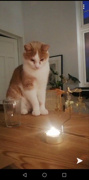 Er mest rød/beige på toppen/baksiden av kroppen mens magen og midten av ansiktet er hvitt. Den har ofte rennende øyne og kan myse litt pga dette. Ganske spe til hannkatt å være. Ca 4 år gammel. Veldig kosete og tillitsfull.