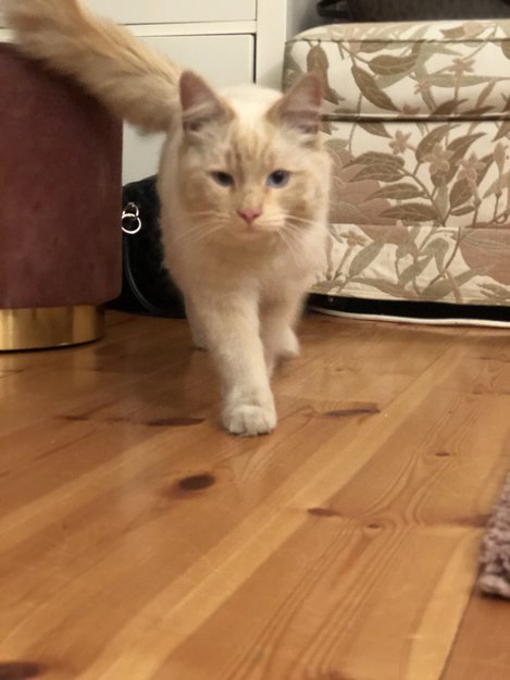 Have found this beautiful pal on my way home.. just next to my house where I live.. He or She tried to climb a tree and was looking for smth in the bushes.. I thought he/she is hungry and gave him/her sushi.. ate it at once, so I realised that its been a wild since he/she has eaten smth :( took him/her home - gave some water and milk.. extremely friendly cat! Hope someone will call me soon :)