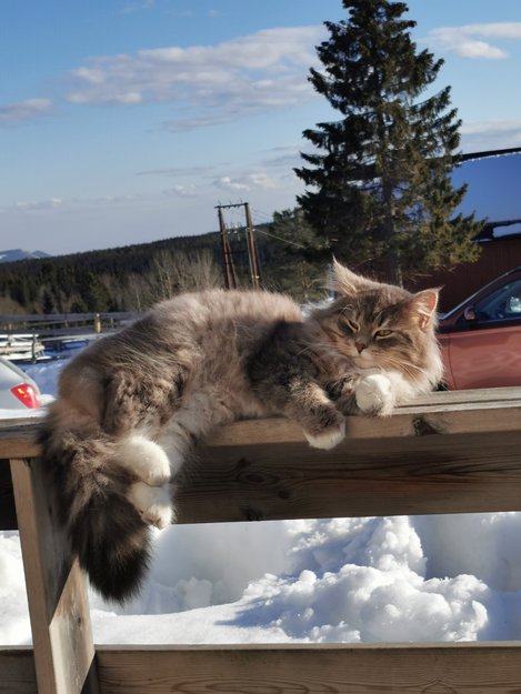 Liten hannkatt med bustete hale. En vakker gråpus som er glad i alt og alle. Hvite labber og brunskjær i det grå.