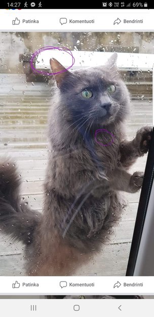 Grå, langhåret hannkatt med grønne øynene. Han har en liten rift i øret på høyre side. Han er kastrert og chippet.