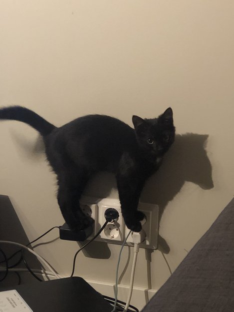 Hun er en liten 7 mnd gammel hunnkatt, helt sort med unntak av en hvit flekk på brystet og en hvit flekk under magen. Veldig liten pus, ca. 3 kilo.