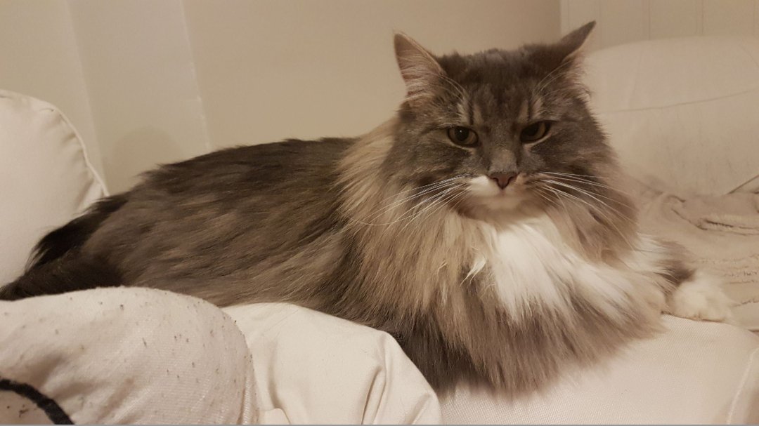 Grå langhåret. Noe mindre/ujevn pels da jeg har klippet/barbert vekk noen floket. Hvitt på brystet og ved nese/munn (se bildet), hvite poter. Ganske lita/slank. Sky/redd når hun er ute og med fremmede.