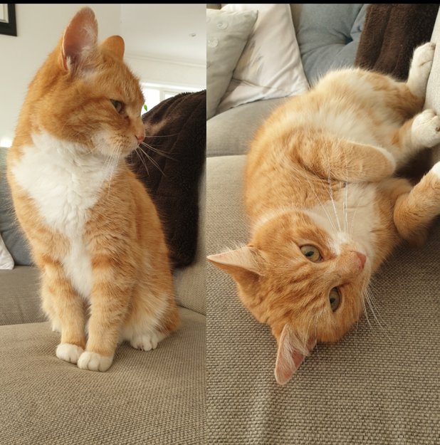 Katten er rustrød, stripete, med hvitt brystparti og poter. En kosete hannkatt
