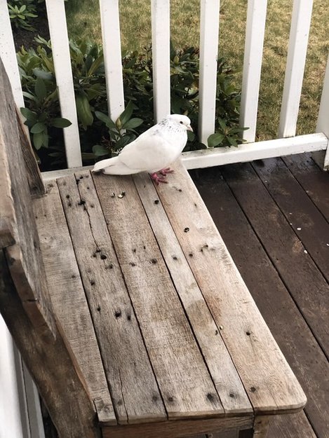 Sto på benken utenfor huset vårt i dag tidlig, kald og våt. Tror den er vingeklippet.