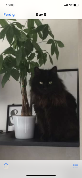Utekatt som oftes sover inne om natta. Han er mer ute på denne tiden av året, men stikker innom 1-2 ganger per dag likevel. Kommer alltid når vi roper på han, så han er sjeldent langt fra huset.