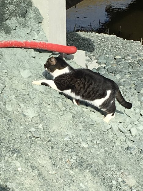 Katten har oppholdt seg her hver dag i en måneds tid+. Virker som den «bor» under ei bro her. Er veldig folkekjær, oppsøker de fleste som går forbi. Glad i kos. Er ikke tynn.