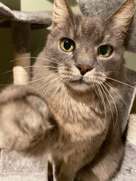 Grå kastrert hannkatt med splitt i venstre øre. I høyre øre er det tatovert ID! Han er chippet og kastrert.