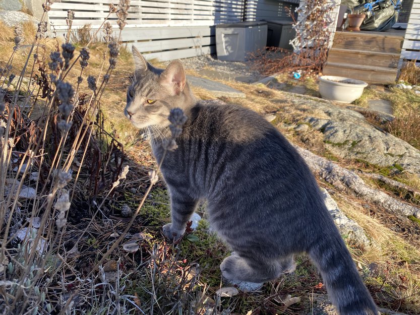 Den er grå med lyse striper. Den er ca 11 mnd. Vil muligens følge etter folk på tur, eller prøve å komme seg inn i garasje el.