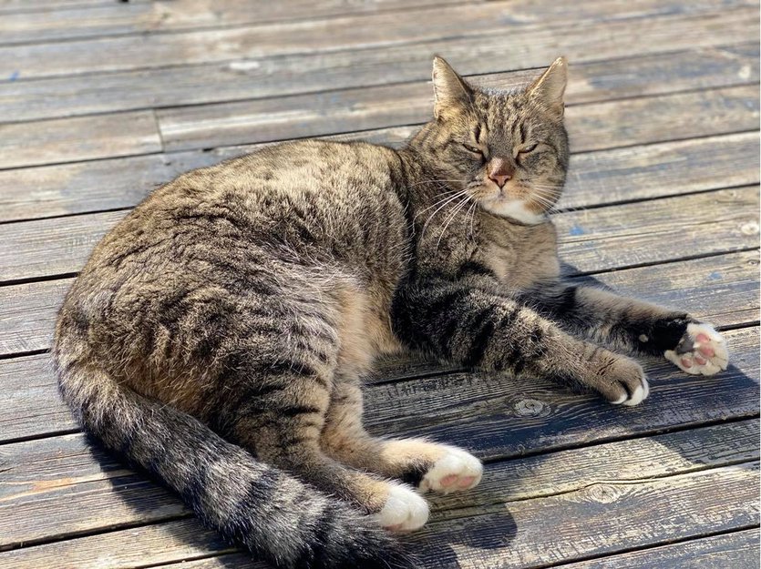 Han kommer ALLTID inn på morgenen og spiser og ligger inne og sover til vi er ferdige på jobb.