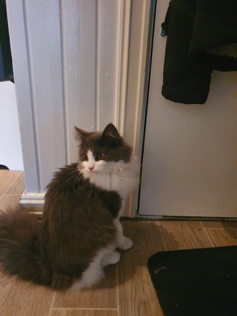 Maja er 10 måneder gammel. En vakker, liten, grå/hvitpus meg bustete hale som er glad i alt og alle.