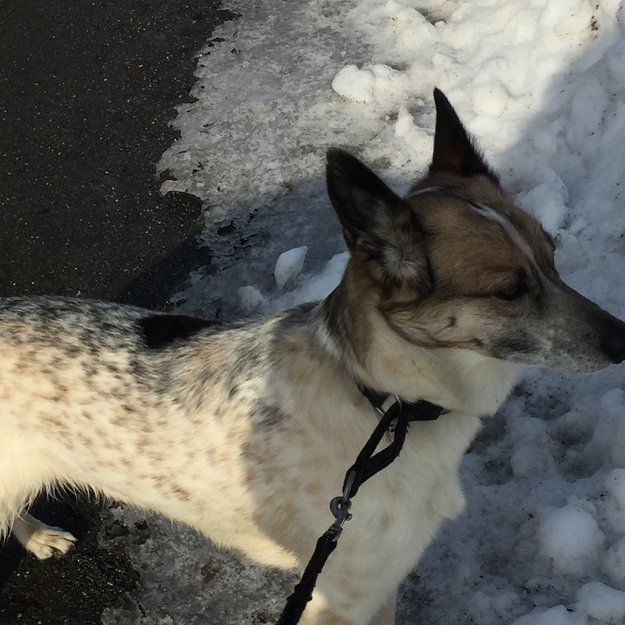 Hvit i pelsen, svart stor flekk på ryggen med små svarte og brune flekker langs ryggen. Brun pels i ansiktet med hvit stripe mellom øynene