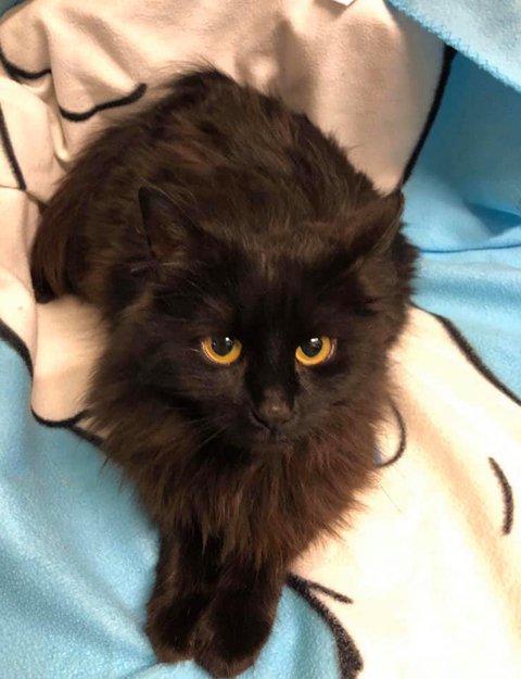 Helt svart langhåret hunnkatt. Har ikke chip. Gravid ved inntak.