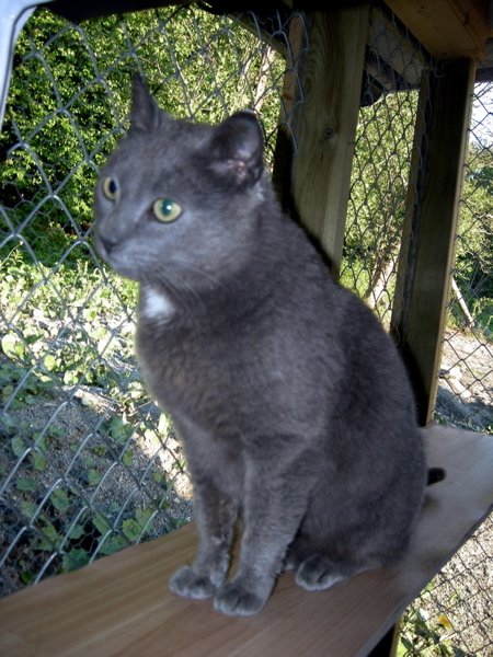 Grå korthåret med hvit flekk i brystet.