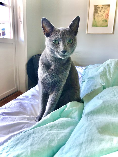 Liten og slank katt, tykk kort pels helt ensfarget grå, gul-grønne øyner avhengig av lyset.