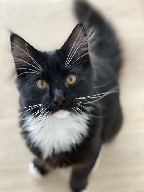 Birger er en sort katt med hvite poter og hvit hals/mage. Lang buskete hale og «tust» øverst på ørene.