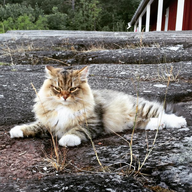 Mio er vant til å være ute og vi bor i et stort grønn område. Han kommer alltid hjem hver dag/kveld ettersom når han ville gå ut.