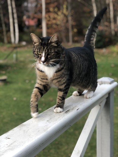 Han er en huskatt med striper brun/svarte, hvit på brystet, poter og på snuten. Han har oransje halsbånd med bjelle. Det står navn og telefonnummer på halsbåndet.