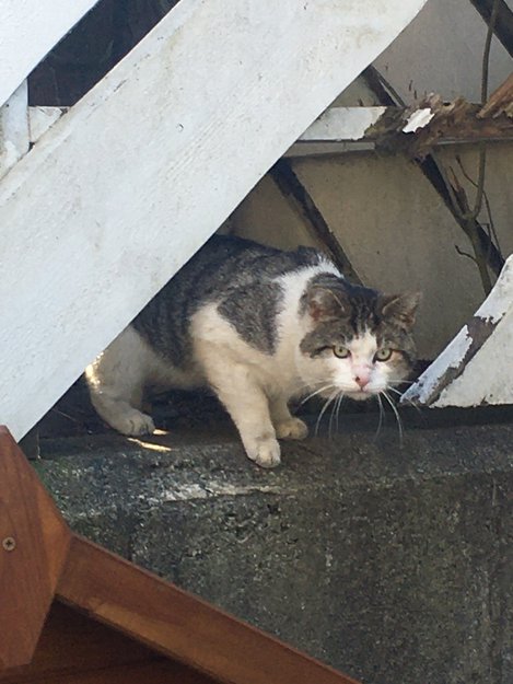 Katt som fremstår som eierløs og svært sky vandrer i området her. Får ikke fanget den inn da den stikker av når jeg nærmer meg.