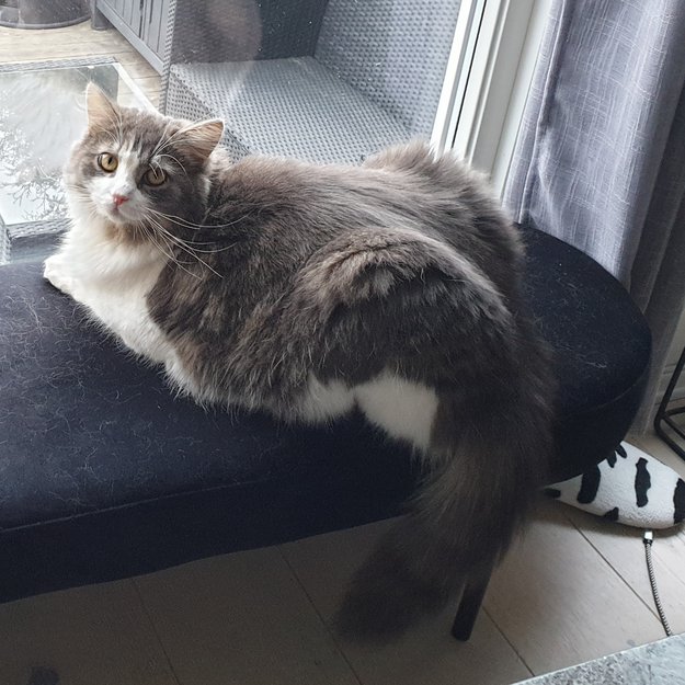 Hun er gråbrun og hvit. I det brune kan man skimte noen striper. Blandingsrase, bl.a litt sibirkatt.