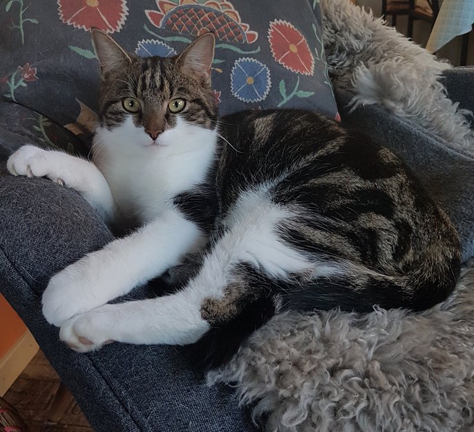 Han er stor for alderen og har særpreget markeringer rundt snuten. Ikke så glad i å bli løftet opp men legger seg gjerne på rygg for å bli klødd på magen. Chippet.