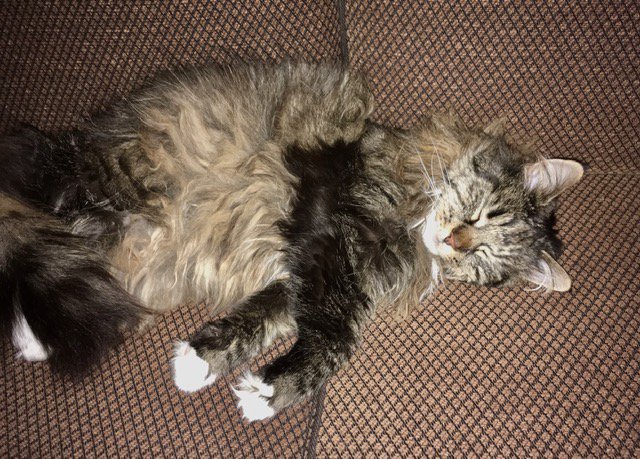 Lita katt. Hvit hake, hvitt bryst, hvite poter, stor brun hale, halvlang pels som kan klumpe seg. Lys brun under. På bildet sover hun.