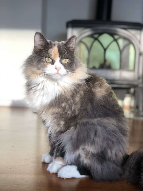 Hun har et spesielt ansikt, hvit og brun i ansiktet. Hvit og brun på magen, grå/spraglet resten av kroppen. Grønne øyne, litt sky for fremmede mennesker
