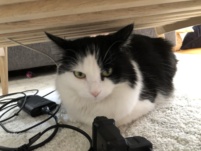 Sort, hvit, semi-langhåret katt. Hun er sort rundt hele venstre øyet hennes.