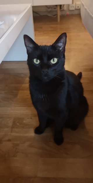 Han er fylt 2 år, helt sort med unntak av få hvite hår på brystet, korthåret, grønne øyne, ekstremt glad i mat og veldig pratsom! Han er kastrert og chippet, så det er unormalt av han å ikke være hjemom for å spise og sove litt.