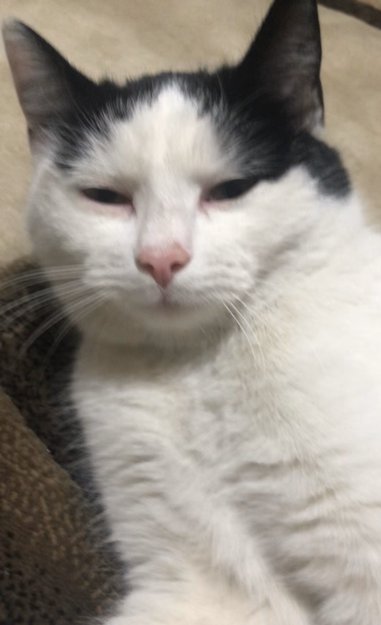 Katten er svart og hvit farge mest hvit og litt svart på hode og ryggen. Har rosa hals bånd med adresse og telefon nummer.