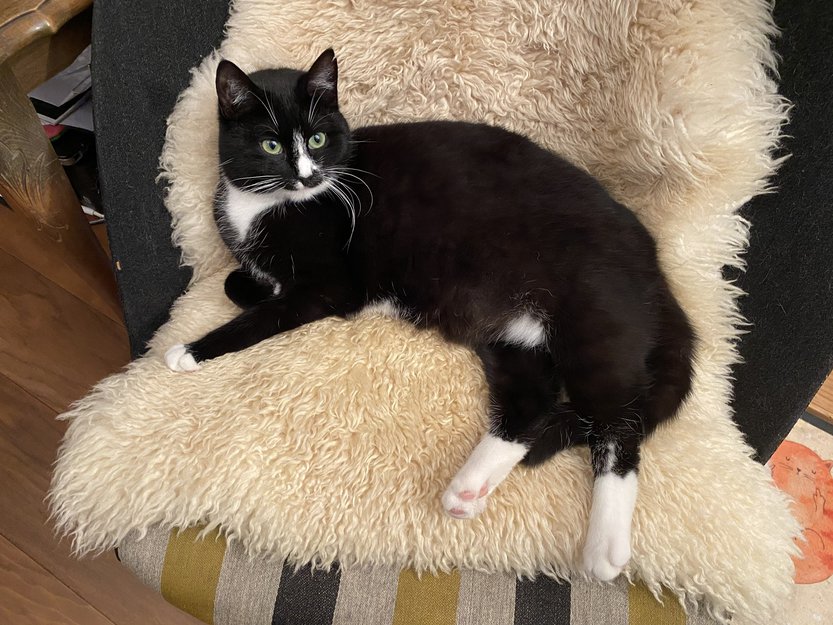 Svart på kroppen, hvite sokker (korte foran lengre bak) og hvit over nesa og på brystet og magen.