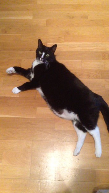 Han er veldig sosial og menneskekjær. Gammel katt, som har litt gikt i potene sine og derfor går litt rart. Har en god hengemage:)